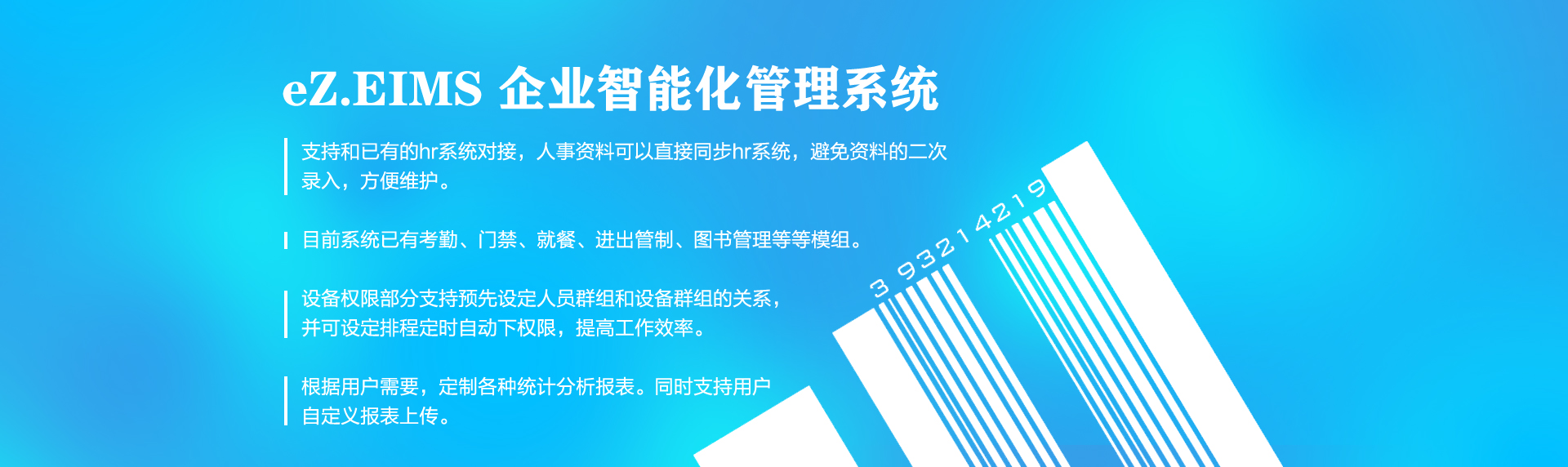 联澳eZ.EIMS 企业智能化管理系统,是智能设备以及先进的跨平台系统整合在企事业单位管理中的应用。联澳科技凭借多年的整合实践经验,利用先进的软硬件整合技术,将Smart Card(智慧卡)和The One Card (一卡通)中的门禁管理、考勤管理、消费管理、签到管理、电梯管理等多元化的识别应用功能,集成于一个元素中,这个元素可能是一部手机、一张卡、一根手指乃至一张脸,并通过专用网络来实现信息资源的共享。
